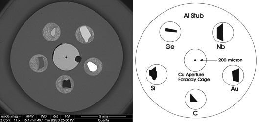 Reference materials: Au, Nb, Ge, Si and C. 200µm copper Faraday cup.