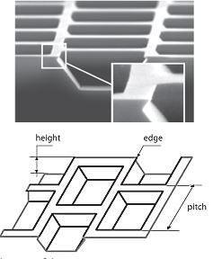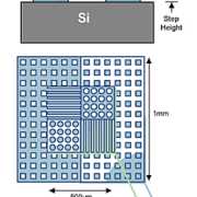 The TGX calibration grating with an undercut edge is made by two-dimensional anisotropic etching along the (111) crystallographic planes of silicon. Typical radius of the edges is 5nm. The TGX calibration grating is intended for lateral calibration of SPM scanners, but is equally useful for detection of lateral non-linearity, hysteresis, creep, cross-coupling effects and determination of the tip aspect ratio. Calibrated pitch is 3um with a non-calibrated step height of 1um. Chip size is 5x5x0.3mm with an active area of 1x1mm. Supplied either unmounted or mounted on a 12mm AFM disc.